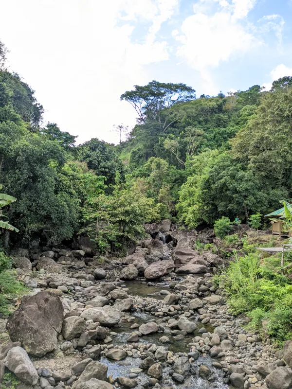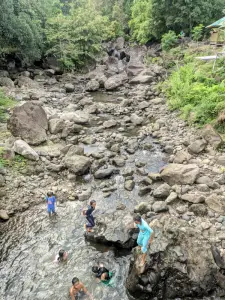 - Lanskap Alam yang Asri: Pengunjung akan dimanjakan dengan pemandangan sungai berbatu yang dikelilingi oleh rimbunnya pepohonan hijau.